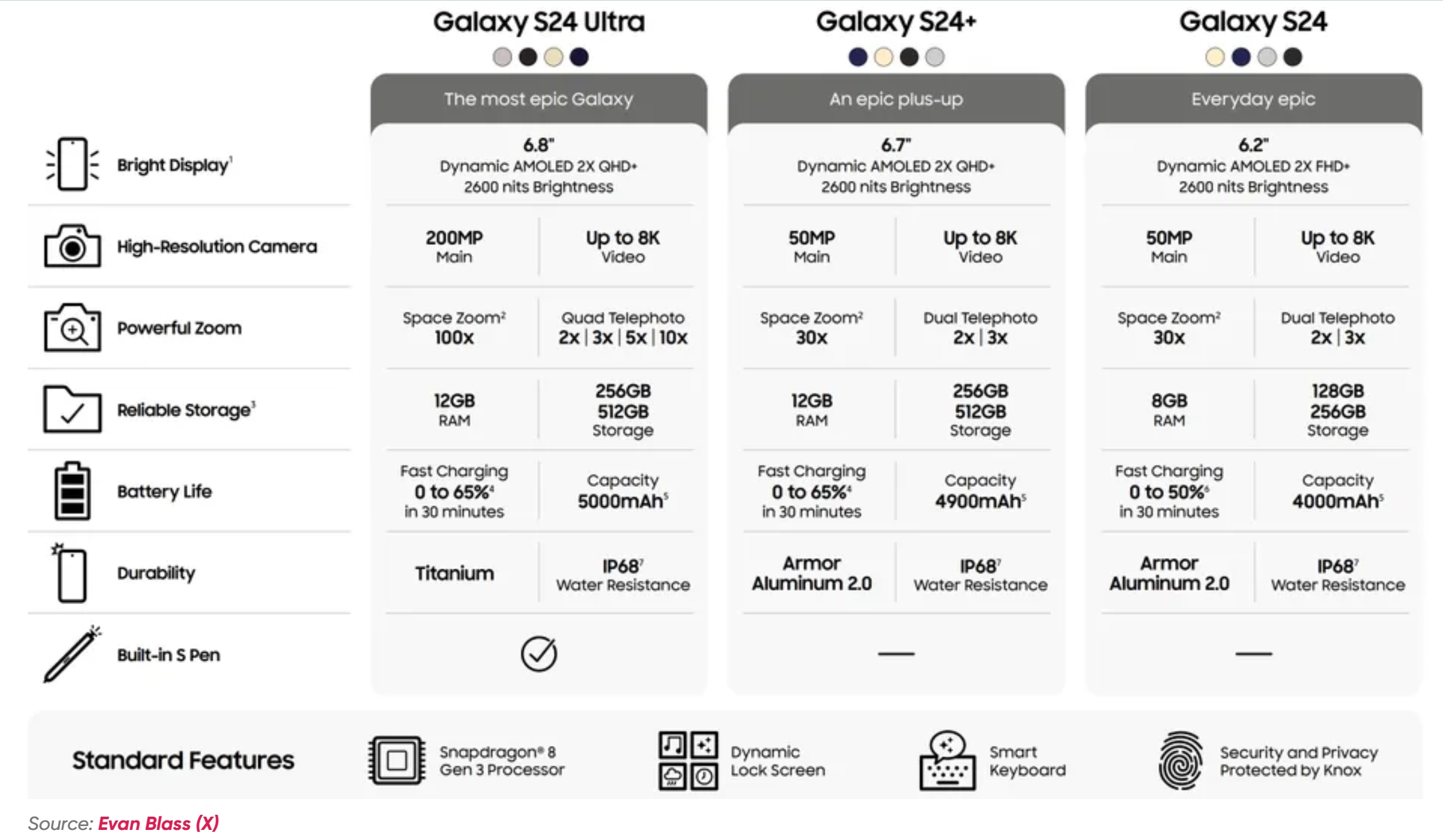 스마트폰의 두뇌와 같은 애플리케이션 프로세서 (AP)는 판매 지역에 따라 두 가지가 탑재될 전망입니다. 삼성전자가 자체 개발한 칩셋인 엑시노스 2400과 퀄컴 스냅드래곤 8 3세대인데요. 우선 갤럭시 S24 울트라는 스탭드래곤 8 3세대 을 사용하지만, 판매국가에 따라 플러스와 일반 모델은 엑시노스가 탑재된다고 합니다.